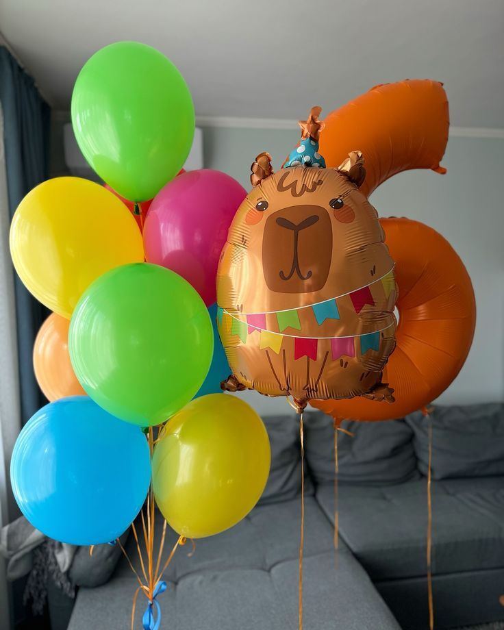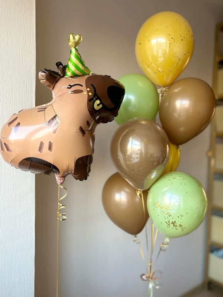✨ Представляем вам яркий комплект воздушных шаров , созданный в честь очаровательной капибары — нового фаворита детских сердец! Этот набор станет идеальным украшением дня рождения, фотосессии или любого другого праздника, где нужно создать неповторимую атмосферу радости и веселья.