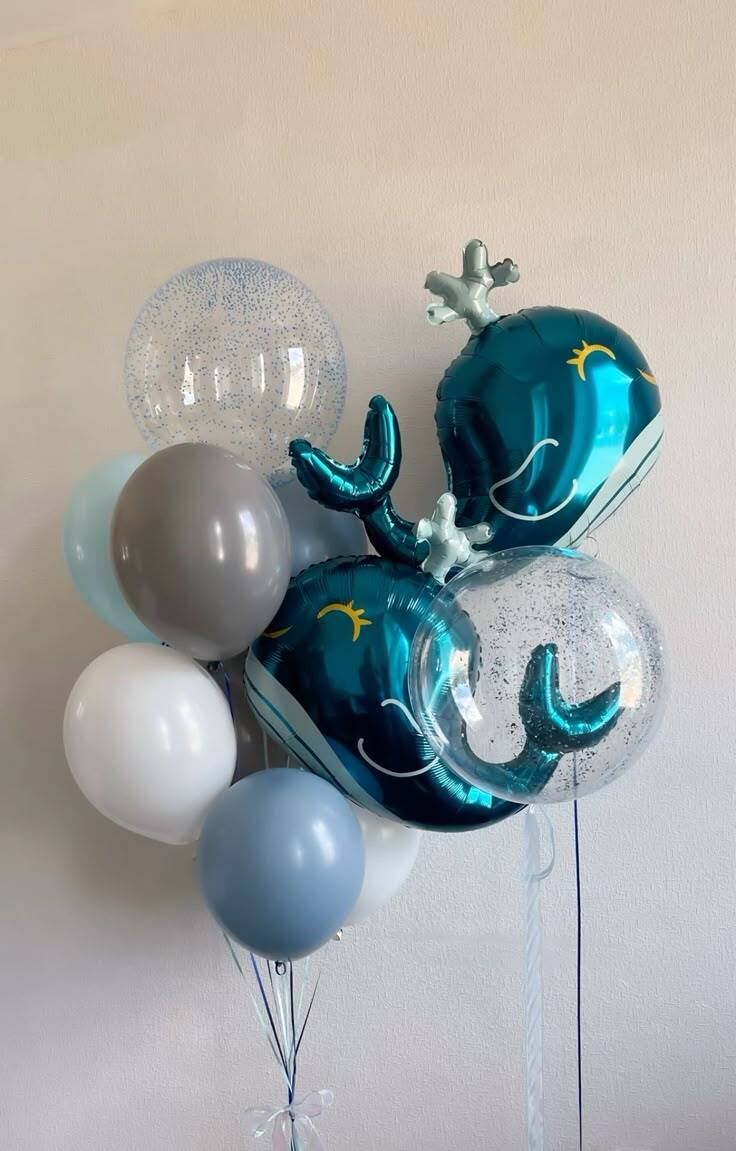 В стоимость входит 2 кита на грузиках, 7 пастельных шаров, 2 баблса 18" с наполнением на грузиках.