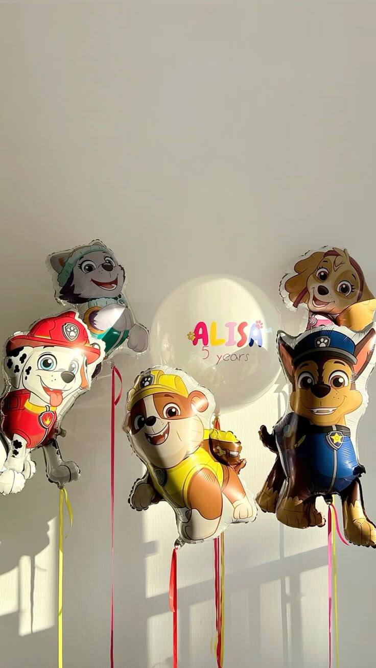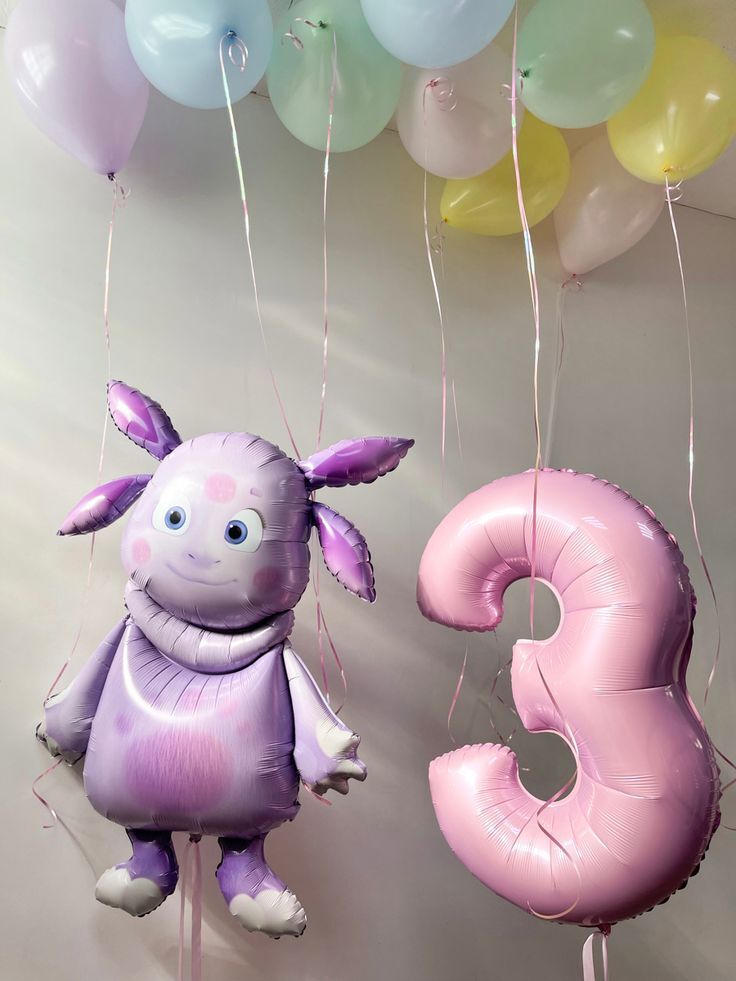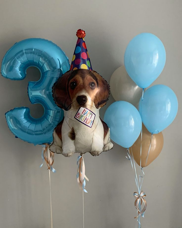 В стоимость входит Щенок 102 см на грузике, цифра на грузике, 5 пастельных шаров на грузике. Все шары на атласных лентах!