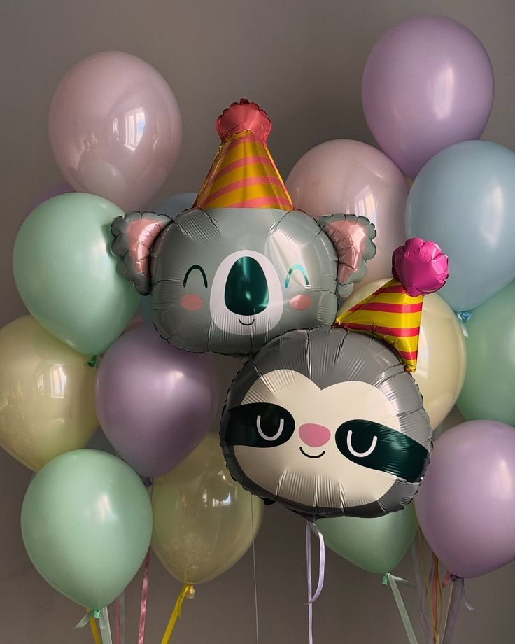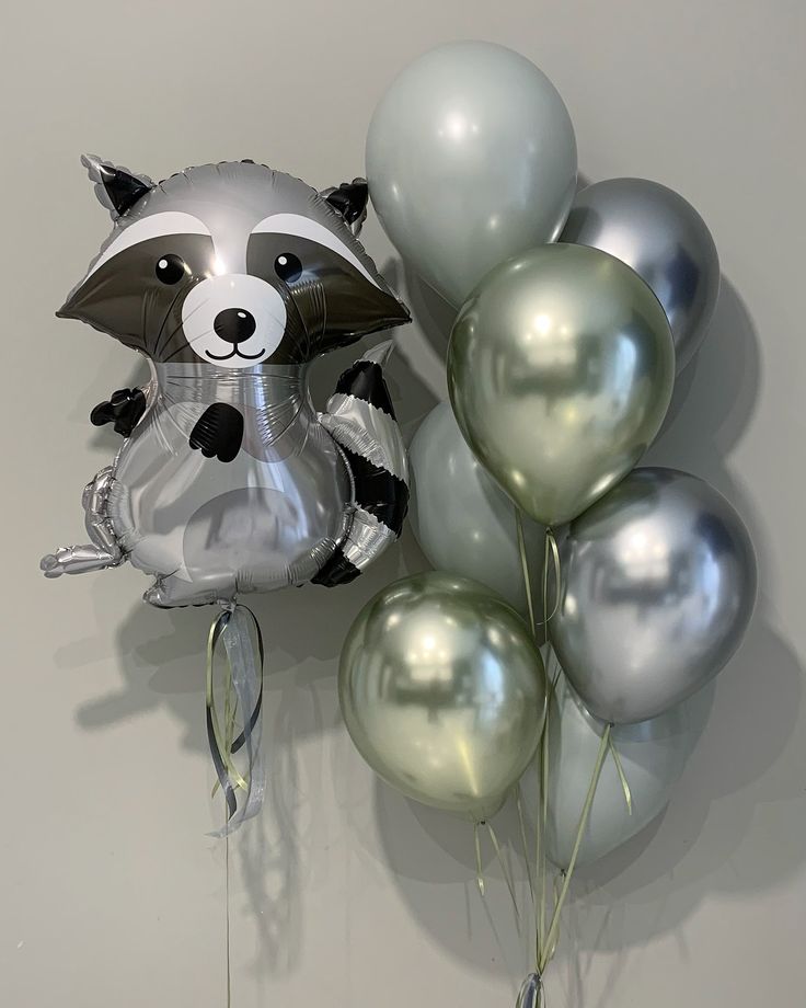 В стоимость входит Енот 30" /76 CM на грузике, 4 шара хром, 3 пастельных на грузике.